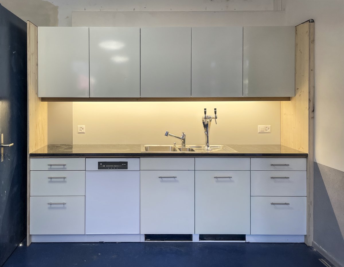 Diese Küche kombiniert gebrauchte Teile mit massgeschneiderten Ergänzung - so kann sie flexibel und passgenau vor Ort einfügt werden.